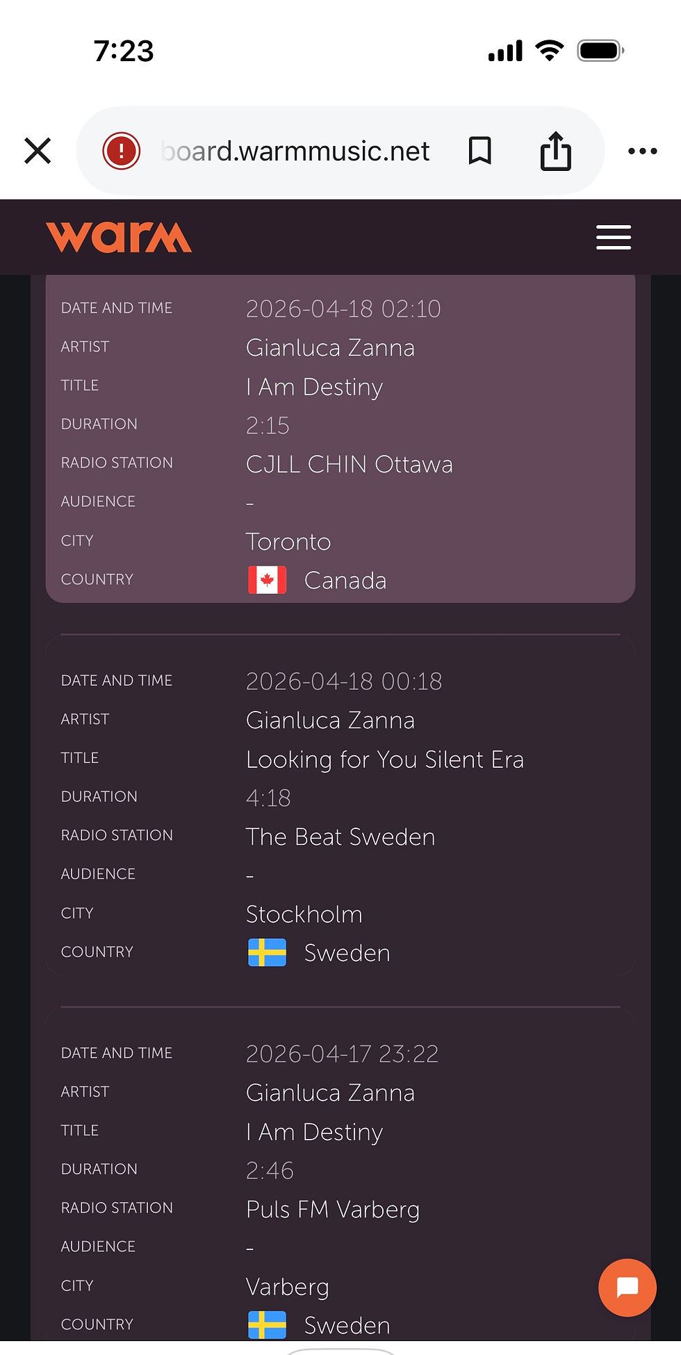 The momentum does not stop there. Zanna's worldwide radio footprint — tracked and verified through the WARM (Worldwide Airplay and Radio Monitoring) system — now spans 251+ stations across 72+ countries on 6 continents.